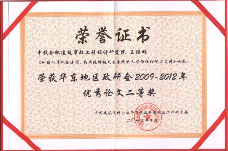 近日,從中國(guó)建筑設(shè)計(jì)企業(yè)華東地區(qū)思想政治工作研究會(huì)(以下簡(jiǎn)稱“該會(huì)”)喜悉,我院王繼雄同志所撰論文《加快人才隊(duì)伍建設(shè),為實(shí)現(xiàn)跨越式發(fā)展提供人才保證和智力支持》獲該會(huì)2009—2012年優(yōu)秀論文二等獎(jiǎng)。