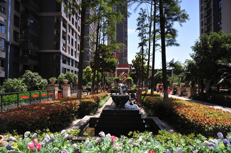 整個小區(qū)以人行主入口形成景觀的主軸線,主軸線向內(nèi)部延伸、滲透,串聯(lián)起樓與樓之間的綠地,構(gòu)成整個規(guī)劃的靈魂。在一期、二期分別設(shè)計了兩個地塊的中心庭園,一期由于用地所限,將位于中心部位的住宅樓底層架空,使景觀能更好地穿插流動。樹陣、流水、疊泉、小運動場沿景觀軸線自然又有序的排布。樓與樓之間形成疏密有致的小庭園,庭園間以景觀軸為紐帶,以中心景觀為核心,做到戶戶有景,步移景異。