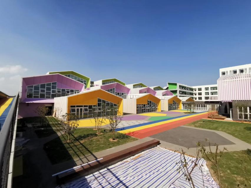 該校是涵蓋幼兒園、小學、初中、高中于一體的全日制雙語學校,在進行立面設(shè)計中結(jié)合不同年級階段學生色彩,進行了色彩分級。通過不同的色彩體系來預示了不同階段的學生,同時采用大量連廊和半地下庭院將各教學區(qū)連接起來,建筑獨特且又和諧統(tǒng)一。