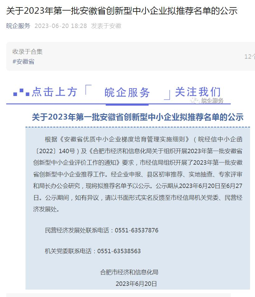近日,合肥市經(jīng)濟和信息化局公示了2023年第一批安徽省創(chuàng)新型中小企業(yè)擬推薦名單,中鐵六院集團合肥院成功入選。